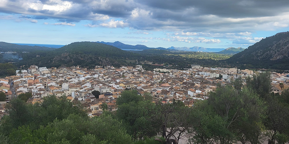 Blick auf Polentia im Norden Mallorcas mit der Bucht von Alcudia im Hintergrund